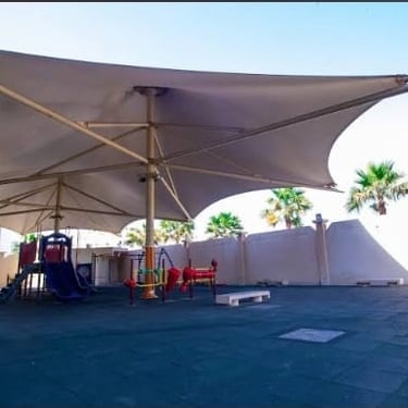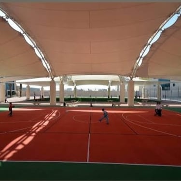 تنفيذ مظلات مدارس آمنة ومناسبة للبيئة التعليمية لحماية الساحات والممرات من الشمس والعوامل الجوية.